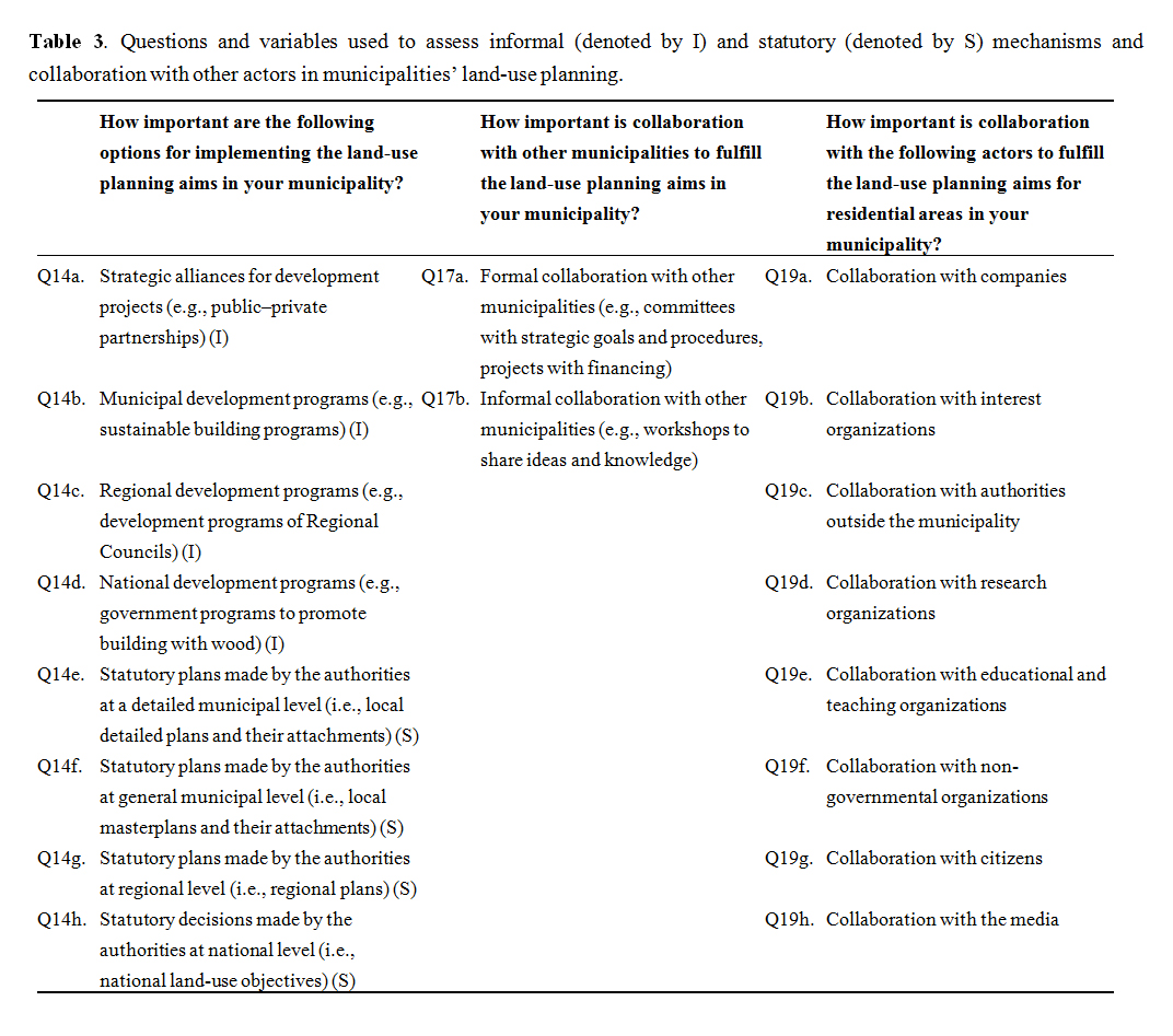 Table 3. Questions and variables used to assess informal (denoted by I) and statutory (denoted by S) mechanisms and collaboration with other actors in municipalities’ land-use planning.