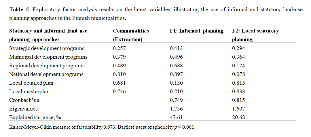 Table 5. Exploratory factor analysis results on the latent variables, illustrating the use of informal and statutory land-use planning approaches in the Finnish municipalities.