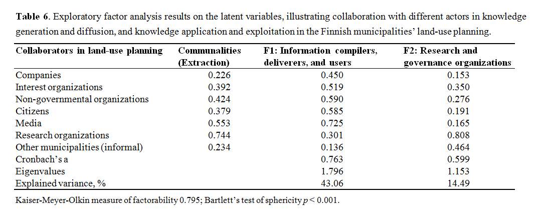 Table 6. Exploratory factor analysis results on the latent variables, illustrating collaboration with different actors in knowledge generation and diffusion, and knowledge application and exploitation in the Finnish municipalities’ land-use planning.
