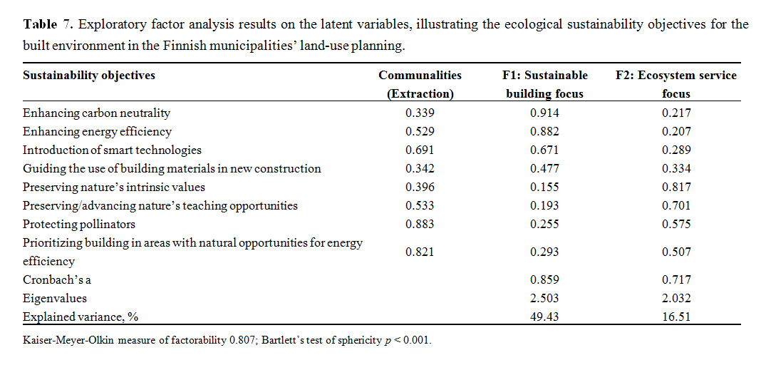 Table 7. Exploratory factor analysis results on the latent variables, illustrating the ecological sustainability objectives for the built environment in the Finnish municipalities’ land-use planning.