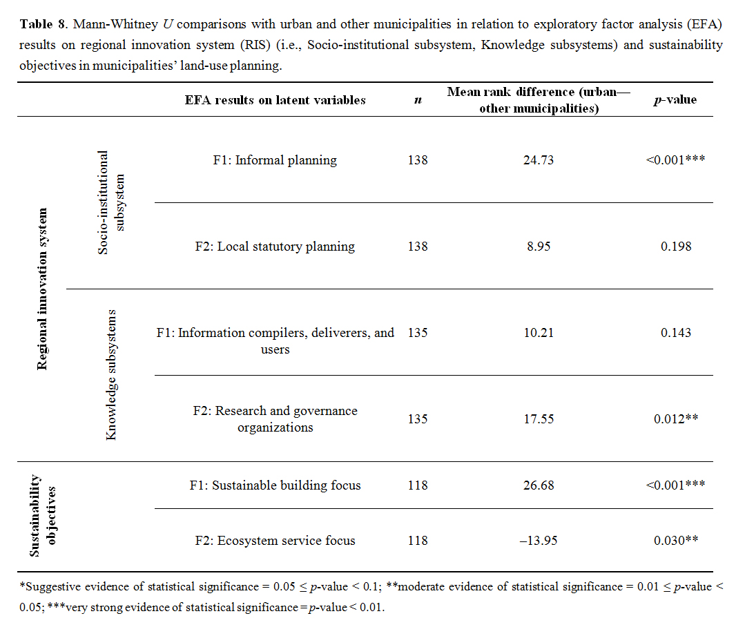 Table 8. Mann-Whitney U comparisons with urban and other municipalities in relation to exploratory factor analysis (EFA) results on regional innovation system (RIS) (i.e., Socio-institutional subsystem, Knowledge subsystems) and sustainability objectives in municipalities’ land-use planning.