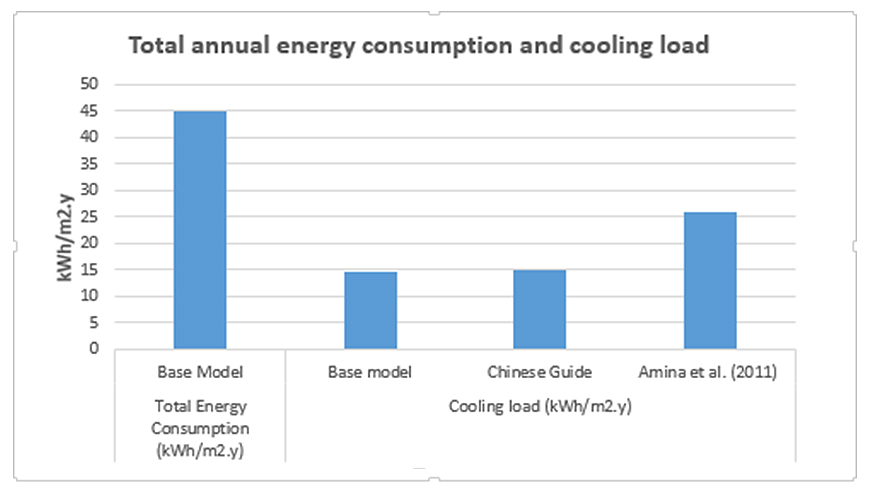 The result of the simulation show that the total annual energy consumption of the whole building is 45.1 kWh/m2 year, which generated 11,919.6 kg CO2 of carbon dioxide emissions. The total annual cooling load of the building is 14.5 kWh/m2 year, representing 35.6% of the total annual energy use. The impact of cooling load predicted mean vote (PMV) and indoor air temperature on energy consumption can also be assessed. Additionally, the annual cooling load of the base model is lower when compared to the result of a study conducted by Amina et al. [13] and the recommendation by Chinese energy efficiency guideline [49] of total annual cooling loads of 26 kWh/m2 year and 15 kWh/m2 year respectively as seen in Figure 10.