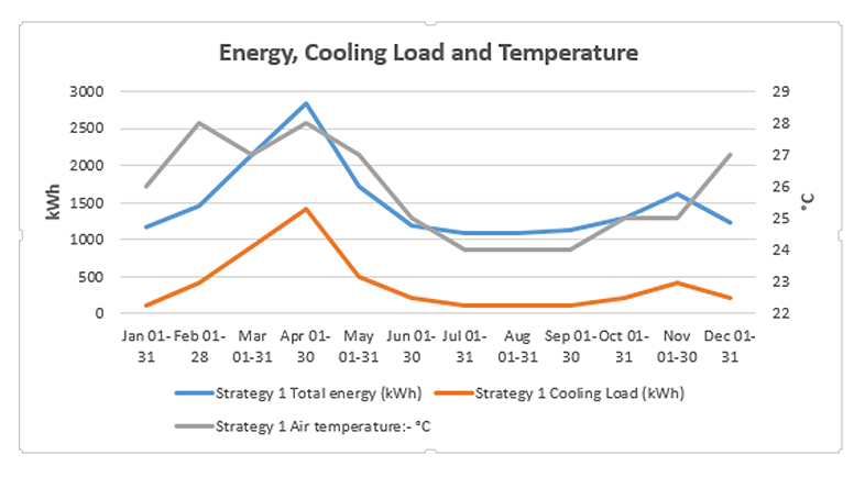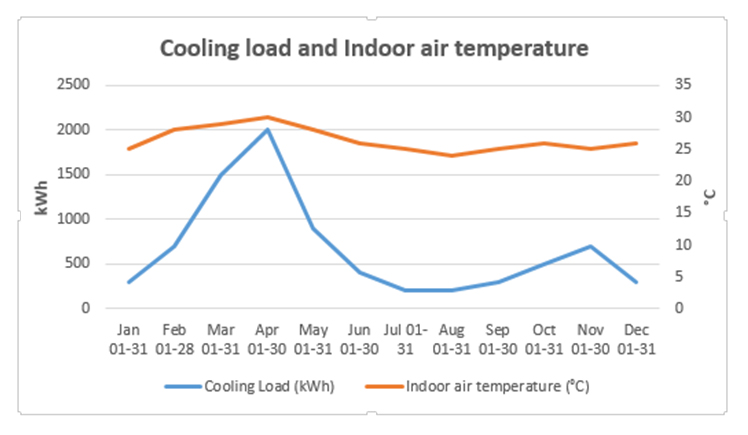 In Figure 11, the peak energy consumption and cooling load are in the summer month of April, and the lowest energy consumption is in the months of August. Also, energy use is very high during the summer months due to the high demand for cooling the indoor space and low during the rainy season and winter months. The cooling demand reduces as soon as the rainy season commences in mid-May. The chart in Figure 11 also shows a strong relationship between the energy use of the building and the cooling load where a high cooling load leads to high energy consumption and vice versa. Similarly, the chart in Figure 12 shows a positive relationship between the cooling load and indoor air temperature. That is, an increase or decrease in indoor air temperature resulted in an increase or decrease in cooling load. Higher cooling load is observed in the summer months of March, April and May because the indoor air temperature in those months is higher, above the comfort conditions of 23–26 ℃ recommended Akande & Michael [4], ASHRAE [36], Hayatu et al [5] and ISO 7730 [37].