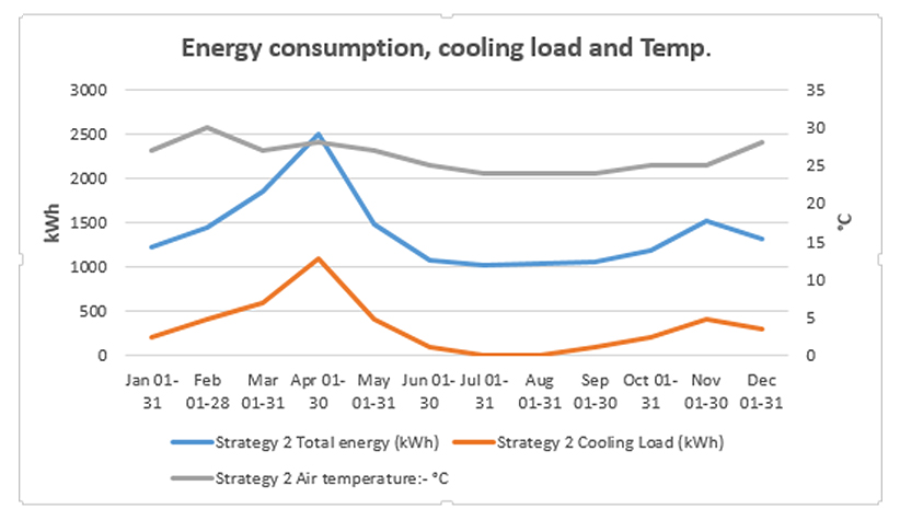 Scenarios and Cases Strategy 1: Traditional building envelopeThe building envelope is optimized using traditional building materials as shown in Table 6. The simulation result shows the total yearly energy consumption of the whole building to be 35.9 kWh/m2 year which generated 9150.6 kg CO2 of carbon dioxide emissions. The total annual cooling load of the whole building is 9.2 kWh/m2 year, representing 25.7% of the total annual energy use of the building.