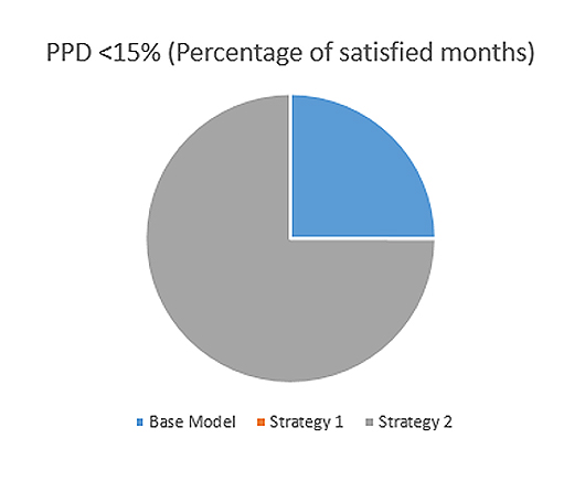 The adoption of any of these strategies can also lead to a reduction in carbon-dioxide emissions as seen in Figure 19. When compared to the base model, there is a reduction in carbon-dioxide emissions by 23.2% and 28.4% when strategy 1 or 2 is used respectively. Figure 20 shows that the cost of electricity can also be reduced by 20.4% and 25.7% when strategy 1 or 2 is adopted respectively. Similarly, strategy 2 performed better when compared to the base model and strategy 1 as 50% of the months achieved a PPD of less than 15% as seen in Figure 21.