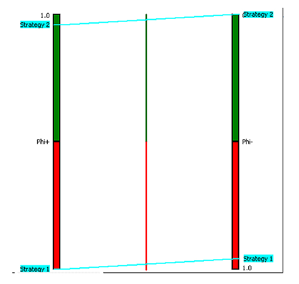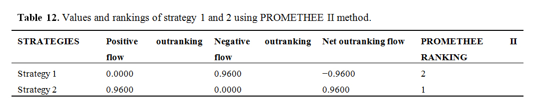 Sensitivity Analysis ApproachThis sensitivity analysis was carried out using a combination of PROMETHEE I, PROMETHEE II and GAIA analysis to ensure robust and stable results. While PROMETHEEI is a partial outranking method that is based on positive and negative flows, PROMETHEE II is a complete outranking method that provides inter-criterion analysis that shows the performance of different alternatives, and GAIA plane shows the performance of the alternatives (strategies 1 and 2) in each criterion and their impacts. The positive, negative and net outranking flows of all the alternatives are presented in Table 12. Positive outranking flow shows how an alternative is outranking other alternatives. The higher the value the better and more powerful the alternative is over other alternatives. Conversely, a negative outranking flow shows how an alternative is outranked by other alternatives. The higher the negative outranking flow the weaker the alternative over others. Additionally, the net outranking flows are derived by finding the difference between the positive and negative flows. The higher the net flow value the better the alternative. The result in Table 12 and Figure 22 shows strategy 2 with the highest positive outranking flow and lower negative outranking flow, making it the best alternative when compared to strategy 1. Figure 22 also shows consistency in the information provided by both flows and the two alternatives are hereby considered comparable. Table 12 and Figure 23 show the net outranking flow (complete preference analysis) where the final ranking of the alternatives is derived, and strategy 2 remains the highest when compared to strategy 1, hence, becomes the best alternative.