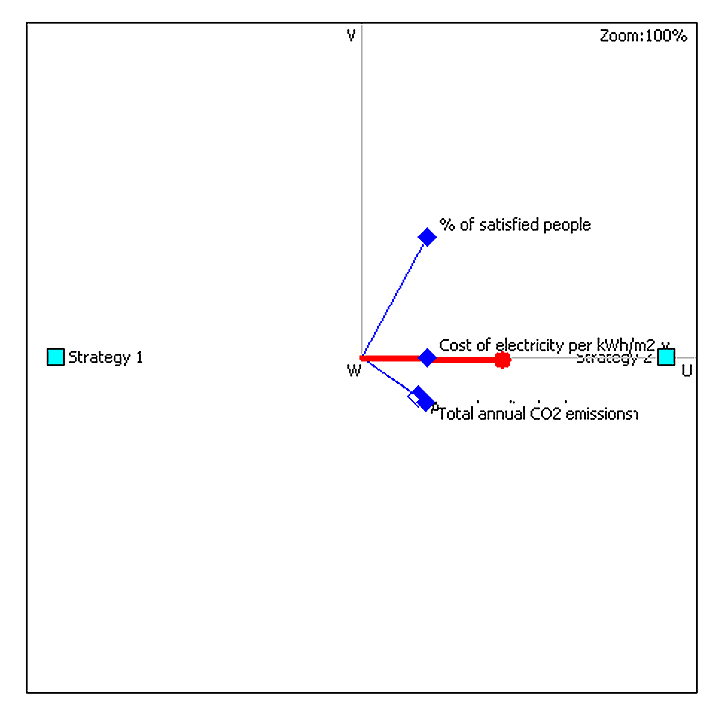 The output from the GAIA plane in Figure 24 shows the graphical display of the alternatives and criteria. The two alternatives are represented by neon blue-coloured squares, the criteria are represented by blue axes and the decision stick is represented by red axis. The result in Figure 24 shows that the Percentage of satisfied people is not expressing similar preference with other criteria because the criterion axis is longer and is not oriented in approximately the same direction as other criteria and red decision stick. The total annual energy consumption, cooling load, CO2 emissions and cost of electricity are expressing similar preferences as they are aligned in the same axes and towards the direction of the red decision stick. Furthermore, the figure also shows a moderate conflict among all the criteria because the red decision stick is pointed towards the right as other criteria. However, the two alternatives (strategies 1 and 2) show a wide conflict as the points are located directly opposite one another. Strategy 2 performed better in all the criteria as they are located on the same axis, pointing towards the decision stick.