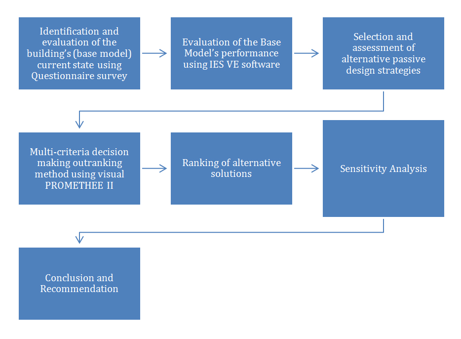 This study investigates a residential building to adopt the best passive design strategy that resulted in indoor thermal comfort improvement and reduction in energy use. To achieve this, a questionnaire was first administered to the building occupants under study to determine the location of the building, building envelope properties, occupancy behaviour and actual energy use. The information obtained will be used in the development of the base model in IES VE software and for comparison with the simulation results. The building’s current state is then subjected to dynamic energy simulation using IES VE software. Different passive design strategies were proposed as scenarios where the base model was optimized. The simulation results were then evaluated and compared to determine the best strategy in terms of reduction in energy use and indoor thermal comfort improvement using multi-criteria decision-making outranking method in visual PROMETHEE II software and then sensitivity analysis as shown in Figure 3. This study adopts a building simulation and multi-criteria methodology to evaluate the impact of passive design strategies in residential buildings in Nigeria and to ascertain which strategy has the highest thermal and comfort performance [88,90].