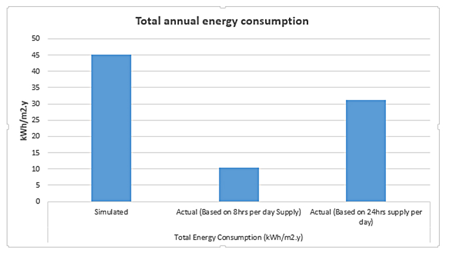 Where Ac, is annual electricity consumption in kWh/m2 year, As, is actual electricity supply per day in hours (8 h), Fs, is full electricity supply per day in hours (24 h per day assumption) and Mc, is measured (actual) annual electricity consumption (10.43 kWh/m2 year).