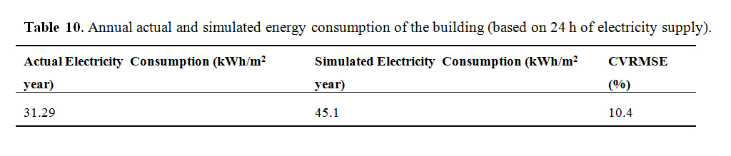 Figure 8 shows the actual and simulated monthly energy consumption of the case study building and their coefficient of variation of root mean square error (CV RMSE). Although there is a wide difference in energy consumption, the consumption trend is almost the same. For instance, the highest actual and simulated energy consumption is in the month of April and the least consumption is in the months of August, December and January. Additionally, the CV RMSE values shown in Figure 8 are higher above the acceptable limit. However, the reason for the large difference is because of the epileptic power supply being experienced in Nigeria [6,48]. Based on the results obtained from a questionnaire survey of the case study building and result from a study conducted by Kayode et al. [48], residential buildings in Nigeria are usually supplied with electricity for only 9–10 h and 6–10 h per day respectively; as opposed to the simulation model that is controlled by 24 h/day electricity supply profile. If the actual annual electricity consumption of 10.43 kWh/m2 year was to be based on an electricity supply of 24 h per day, the annual energy consumption would be 31.29 kWh/m2 year as seen in Equation (14). Additionally, when the CV (RMSE) of the simulated annual energy consumption is recalibrated with the new actual annual electricity consumption of 31.29 kWh/m2 year (based on 24 h per day electricity supply), the result (CV RMSE value of 10.4%) is within the acceptable limit recommended by ASHRAE 14 guidelines and is hereby accepted as seen in Table 10. Figure 9 shows a large difference between the actual annual energy consumption (based on an average of 8 h electricity supplies) and the simulated result of the building under study. However, the same figure shows an acceptable difference is observed when the actual energy consumption was recalibrated based on 24 h electricity supply. Linear regression is also carried out in SPSS to ascertain the accuracy of the calibration and the correlation between the actual and simulated energy consumption. A correlation coefficient (R2) of 0.515 was obtained based on the results of Figure 8, showing a partially strong correlation between the actual and simulated energy consumption.