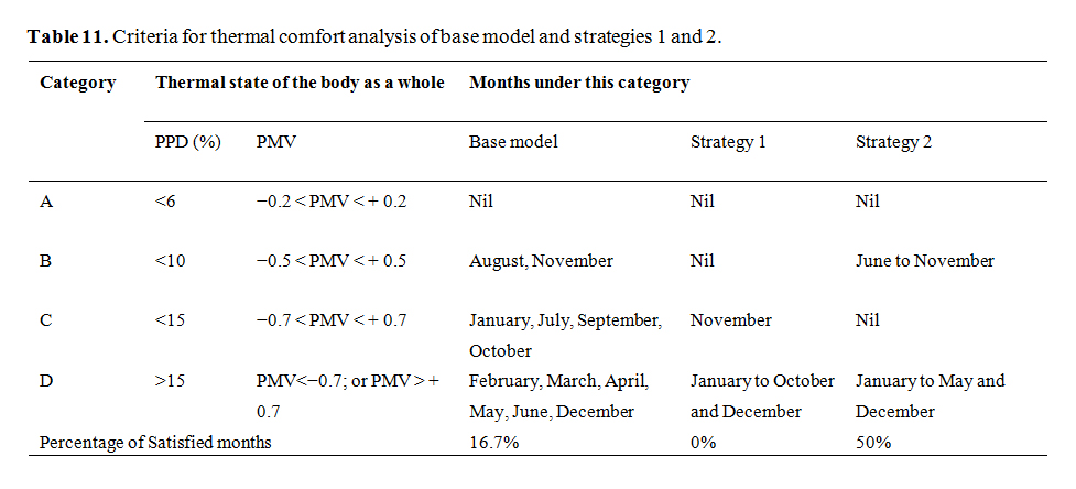 Comfort analysis for base model and strategy 1 and 2This section analyses the comfort performance of the base model, strategies 1 and 2. The analysis is based on EN 15251 [38], ISO 7730 [37] and a study conducted by Graziano, Jens & Marta [25] and the result can be seen in Table 11. From the table, thermal comfort analysis for the base model shows only the months of August and November are within the comfort limit of −0.5 < PMV < +0.5 (PPD < 10%), representing 16.7% and 83.3% months of satisfaction and dissatisfaction respectively. Similarly, the comfort analysis of strategy 1 shows all the months are within the range of dissatisfaction (PPD > 15%), representing 0% months of satisfaction and 100% dissatisfaction. The analysis of strategy 2 shows the months of June to July to be within the comfort limit of –0.5 < PMV < + 0.5 (PPD < 10%), representing 50% and 50% months of satisfaction and dissatisfaction respectively.