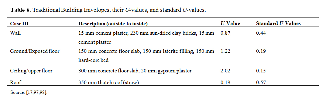 Strategy 1: Traditional building envelopeThis strategy seeks to compare the modern building materials used in the base model to the locally available (traditional) building materials in common use in the climate under study [97]. In the Northern part of Nigeria which is predominantly hot-dry climate [17], the traditional buildings are constructed of non-durable materials such as elephant grasses, reeds, and leafages. Houses and boundary walls are built with mud (adobe), or sun-dried bricks (tubali) made from clay [97]; The common roof types found in the North are dome-shaped or flat roofs usually made of clay, matting or thatched [98]. Table 6 shows the traditional building envelope and its U-values.