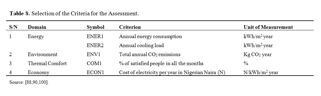 IES VE, Integrated Environmental Solutions-Virtual Environment; PROMETHEE, Preference Ranking Organisation Method for Enrichment Evaluation; PMV, Predicted Mean Vote; PPD, Predicted Percentage of Dissatisfied; KWh, kilowatt hour; kWh/m2 year, kilowatt hour per meter square per year; GHG, Greenhouse gases; CO2, Carbon dioxide; UHI, Urban Heat Island; ASHRAE, American Society of Heating, Refrigeration and Air-Conditioning Engineers; ISO, International Organisation for Standardisation; CIBSE, Chartered Institution of Building Service Engineers; BREEAM, Building Research Establishment Environmental Assessment Method; NZEBs, Nearly Zero Energy Buildings; CV RMSE, Coefficient of Variation of Root Mean Square Error; W/M2K, Watts per meter square Kelvin; A.S.L, above sea level; FGoN, Federal Government of Nigeria; KM2, kilometre square; N, Naira; Kg CO2, Kilogram of carbon dioxide