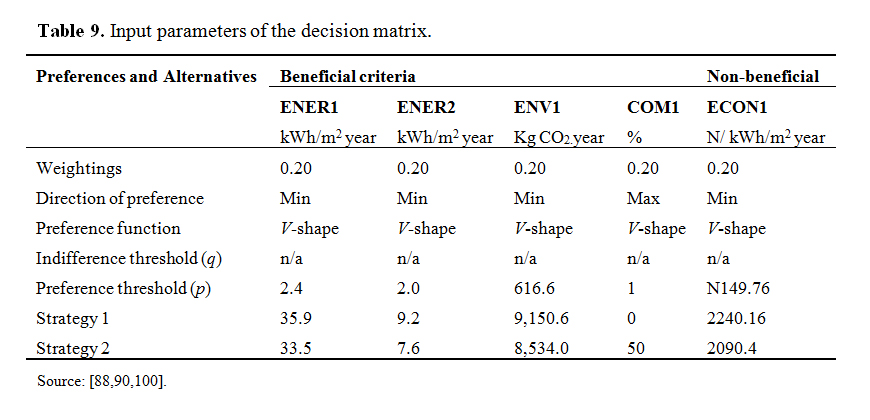 Table 9 shows the parameters to be inputted into the Visual PROMETHEE II software after defining the alternatives and criteria. The performance of each alternative relative to each criterion is also shown. The weighting of the criteria is based on three experts’ opinions. After completing the decision matrix (which is based on Equations 3 to 8), the data is inputted into the software for analysis.