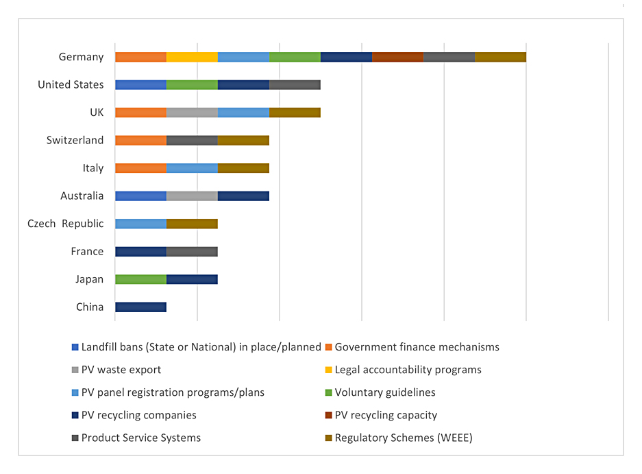 Review of papers on existent practices worldwide provide a perspective of the strategies that are being embraced in specific countries. Germany leads the list of PV waste management strategies in place as can be seen in Figure 1. Figure 1 summarizes PV waste management initiatives adopted in 10 countries based on reflection from existing studies [12,27]. The criteria for countries’ selection in Figure 1 was based on the number of practices towards PV waste in each country and contrasting them with Australian initiatives. PV recycling research has been explored mainly in Japan, Europe and United Estates [12].