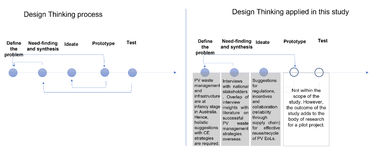 Literature review and ideation stages require iterations as unknown factors, due to the relative novelty of PV waste management solutions in Australia while technological innovations in PVs keep arising. In this study, the research established inductively and through coding, themes and relationships in the data collected to understand the problem and explore possible solutions.