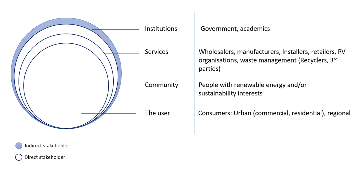 Direct stakeholders are the stakeholders that are in constant interaction with PV panels or related services. Indirect stakeholders are stakeholders which have less contact (in comparison to direct stakeholders) with PV panels or related services.
