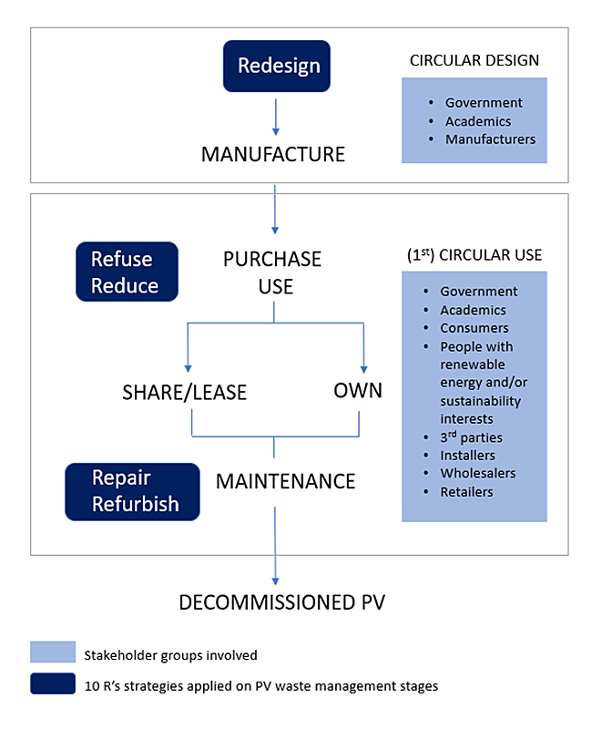 Each of the 9 R’s that are possible to adopt (Recover as incineration process is not part of a circular economy strategy) imply a system of stakeholders and logistics which should be designed in a general framework which clearly states responsibilities and costs involved. Therefore, an efficient PV waste management system requires actions to be taken even before the PV reaches the phase it is considered waste.