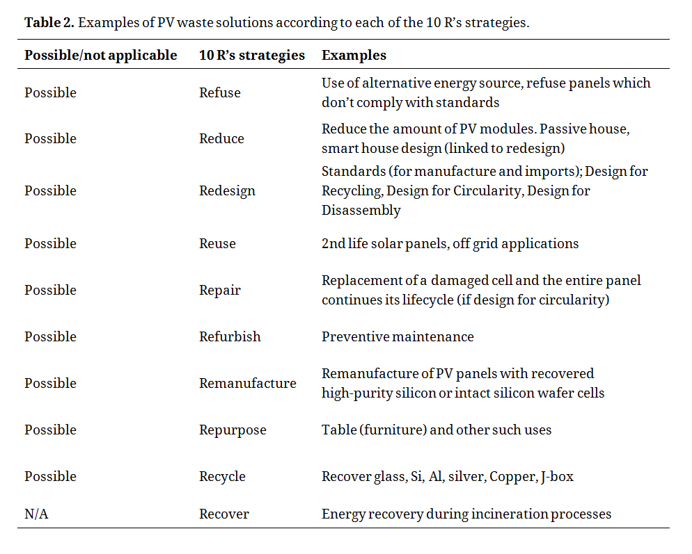 Table 2. Examples of PV waste solutions according to each of the 10 R’s strategies.
