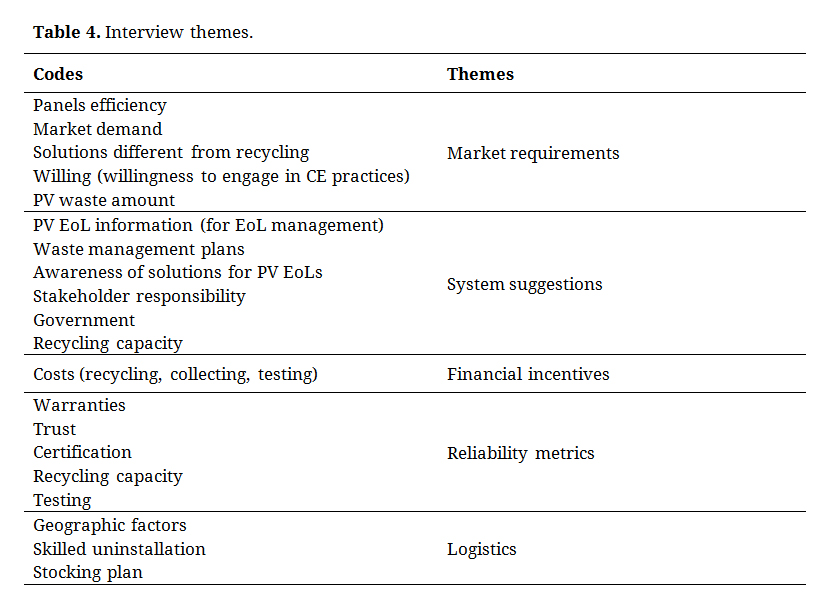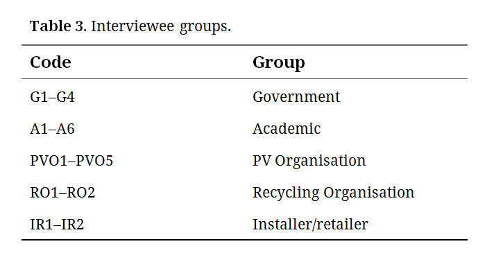 This research used semi structured interviews as qualitative methods complemented by literature review to show the current needs and limitations for a PV waste management system in Australia. As mentioned, the key objective was to develop a systemic design where stakeholders of the supply chain embrace solutions based on circular economy principles and lessons learnt from overseas best-practice examples. Table 3 depicts the different stakeholder groups recruited for the interviews and their respective code.
