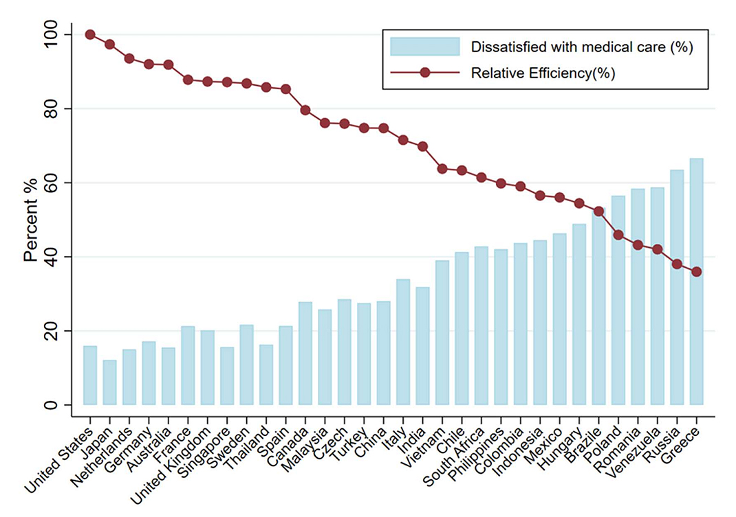 Figure 1. Multinational percentage of dissatisfaction with medical care systems/services. Note: Relative efficiency denotes the ratio of national public health expenditure and the dissatisfaction felt with public medical care; the United States as the comparator value is normalised as 100.