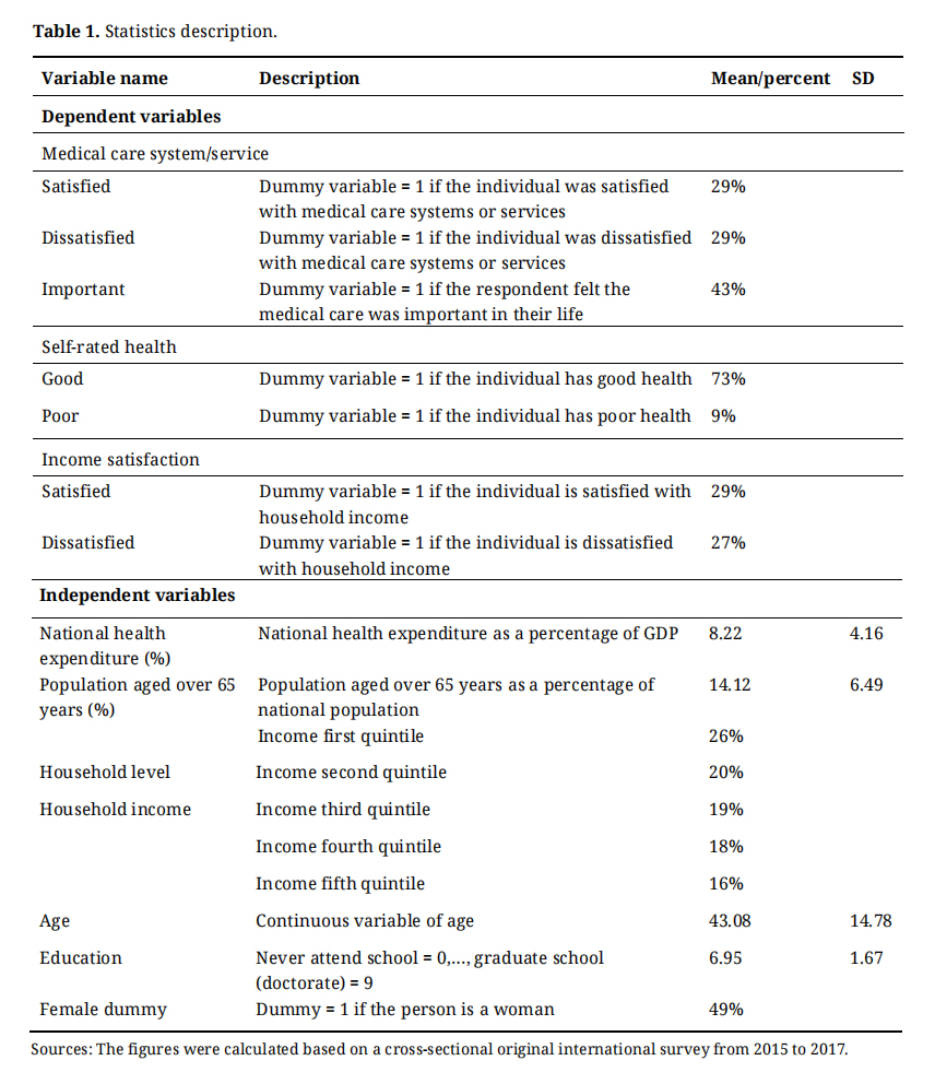 We hypothesized that national health expenditure positively affected well-being, which would improve the respondents’ subjective assessment of medical care systems or services and reduce health-related and financial inequalities. Accordingly, the negative values for the expected coefficients fj represented the dissatisfactory responses to such systems or services (“dissatisfied”), self-rated health (“poor”) and household income (“dissatisfied”). Conversely, positive values for j represented the responses to such systems or services (“important”), medical care (“satisfied”), and household income (“satisfied”).