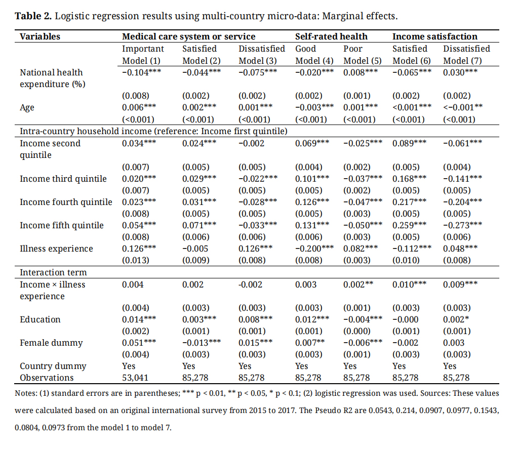 Table 2 displays the estimated marginal effects of the covariables from the logistic regression (see equation (1)), which were obtained using pooled samples from 37 nations. The regression included the subjective evaluation of medical care systems or services (important, satisfied, or dissatisfied), self-rated health (good or poor), and income (satisfied or dissatisfied) and considered them related to the national health expenditure of GDP (%), with other variables being used as controls.