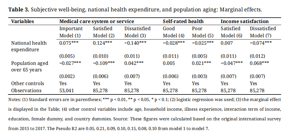 Table 3. Subjective well-being, national health expenditure, and population aging: Marginal effects.