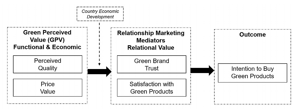 Furthermore, despite the worldwide nature of green consumerism, most studies on green perceived value examine consumer behavior in one country only. Comparative studies are rare, especially research that sheds light on specific distinctions between green consumers in developed and emerging markets. There are disparities in consumption between developed and developing countries [8], and, as the world population grows faster in emerging markets [9], so does the consumption that contributes to environmental problems [10]. Consequently, consumers in less economically developed regions of the world are also seeking to alleviate their environmental footprint by choosing green products over their alternatives. Therefore, this study addresses a research gap by providing a distinct cross-country comparative perspective on GVP and buyer’s intention to buy green products. It sheds light on how companies can raise consumers’ green perceived value of their products to an increasingly global green consumer market by focusing on the value creation of their sustainable business models.