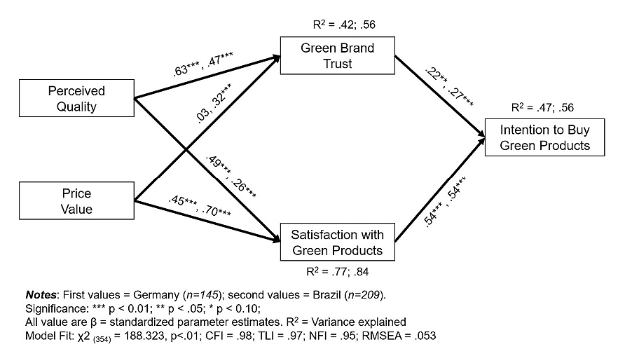 The explanatory and predictive power of the model is robust. Combined, the direct effects of perceived quality and price value explain 42% (Germany) and 56% (Brazil) of variation in green brand trust and 77% (Germany) and 84% (Brazil) of variation in green satisfaction. In turn, green brand trust and green satisfaction explain 47% (Germany) and 56% (Brazil) of variation in consumers’ green buying intention. Green brand trust and green satisfaction are not only direct determinants of a buyer’s green purchase intentions, but they also partially or fully mediate the relationships between green perceived value factors and outcome in Germany and Brazil. Overall results demonstrate the importance of economic value to consumers in developing countries, as well as functional and relational to consumers in developed and developing countries alike.