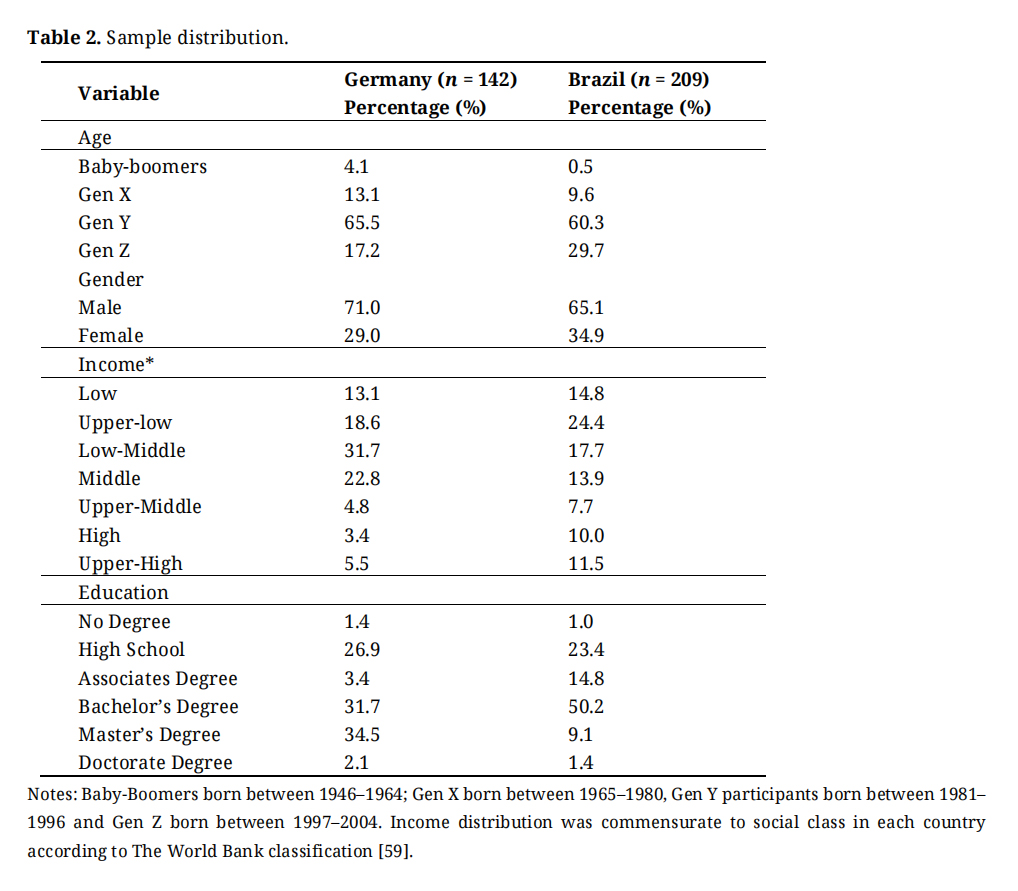 Sample results demonstrate the high diversity among respondents [54]. There were some differences and similarities between the German and Brazilian samples. Both Brazilian and German samples included a large portion of males, and they were comparable in terms of age and income, key similarities for the context of this study. A higher percentage of German participants reported having a master’s degree, thus the German sample tended to be slightly more educated. Overall, the samples were comparable enough to allow for statistical comparison analyses of the survey results.