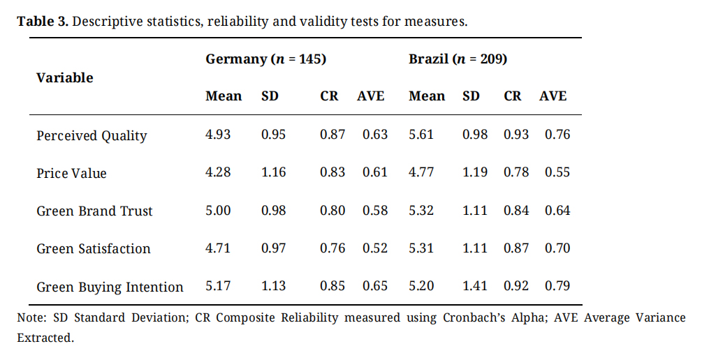 Graça S, Kharé V. The Influence of GPV, Trust and Satisfaction on Intention to Buy Green Products in Germany and Brazil. J Sustain Res. 2024;6(2):e240013. https://doi.org/10.20900/jsr20240013