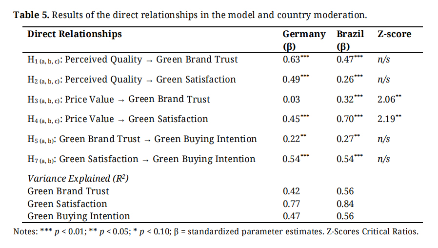 As shown in Table 5, full support is found for hypotheses H1 (a, b), H2 (a, b), H3 (b), H4 (a, b), H5 (a, b), and H7 (a, b). Apart from price value on green brand trust in Germany—as H3 (a) is not supported—the direct and significant effects of green perceived functional and economic values on relational factors (green brand trust and green satisfaction) are confirmed. The ‘c’ series of hypotheses tested country differences. Results suggest that H1 (c) and H2 (c) are not supported. The impacts of perceived quality on trust and satisfaction are positive for both groups, and their difference in value is not found to be statistically significant. However, H3 (c) and H4 (c) are fully supported, suggesting that price value has a greater effect on trust and satisfaction in Brazil. The parameters for each country are statistically and significantly different.