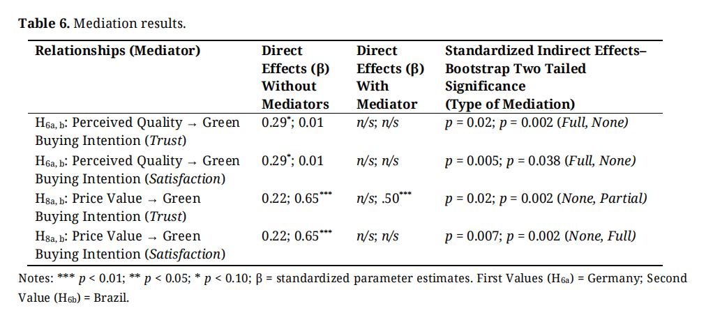 H6 (a, b): Green brand trust will mediate the relationship between perceived quality and price value and a consumer’s intention to buy green products and services (a) in Germany and (b) in Brazil.