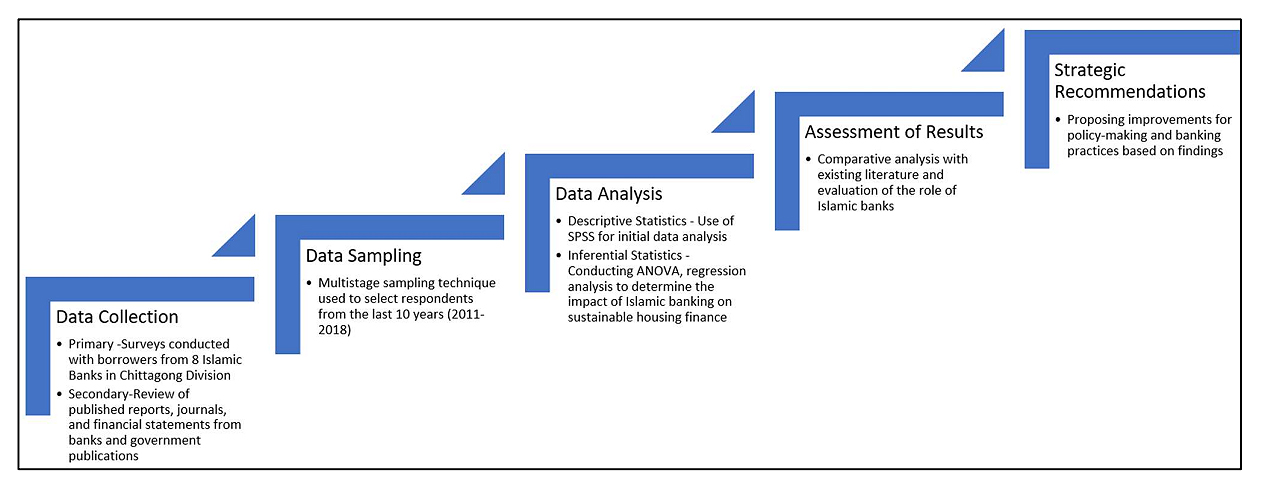 To ensure a thorough understanding of the methods used in this study, we have adopted a mixed-methods approach, combining both qualitative insights and quantitative data analysis. This methodology allows for a comprehensive examination of the role of Islamic banks in promoting sustainable housing finance in the Chittagong Division. A detailed flowchart of the research process is included (see Figure 1), illustrating the sequential steps from the initial data collection through to the final analysis. This visual representation aids in clarifying the study’s design and helps articulate the interconnections between different phases of research.