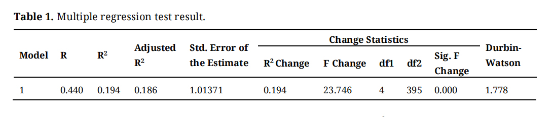 Table 1. Multiple regression test result.