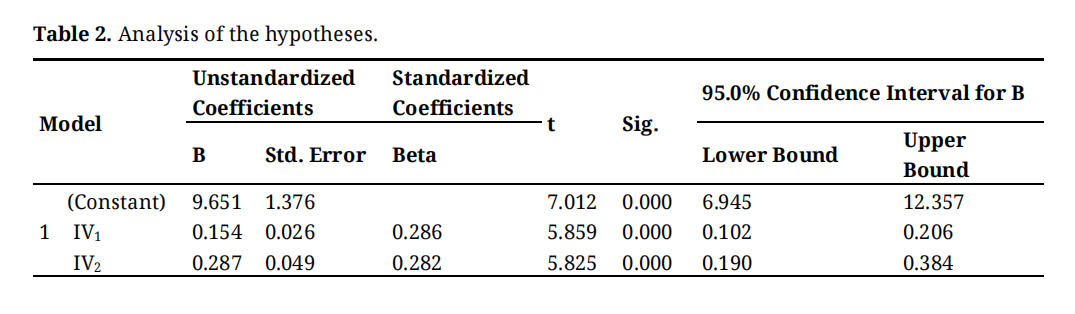 Table 2 presents the regression analysis results for two independent variables on the dependent variable. Both independent variables have significant positive effects, with unstandardized coefficients of 0.154 and 0.287, respectively, and p-values (Sig.) of 0.000. The analysis shows that the model’s constant is also significant, with a coefficient of 9.651.