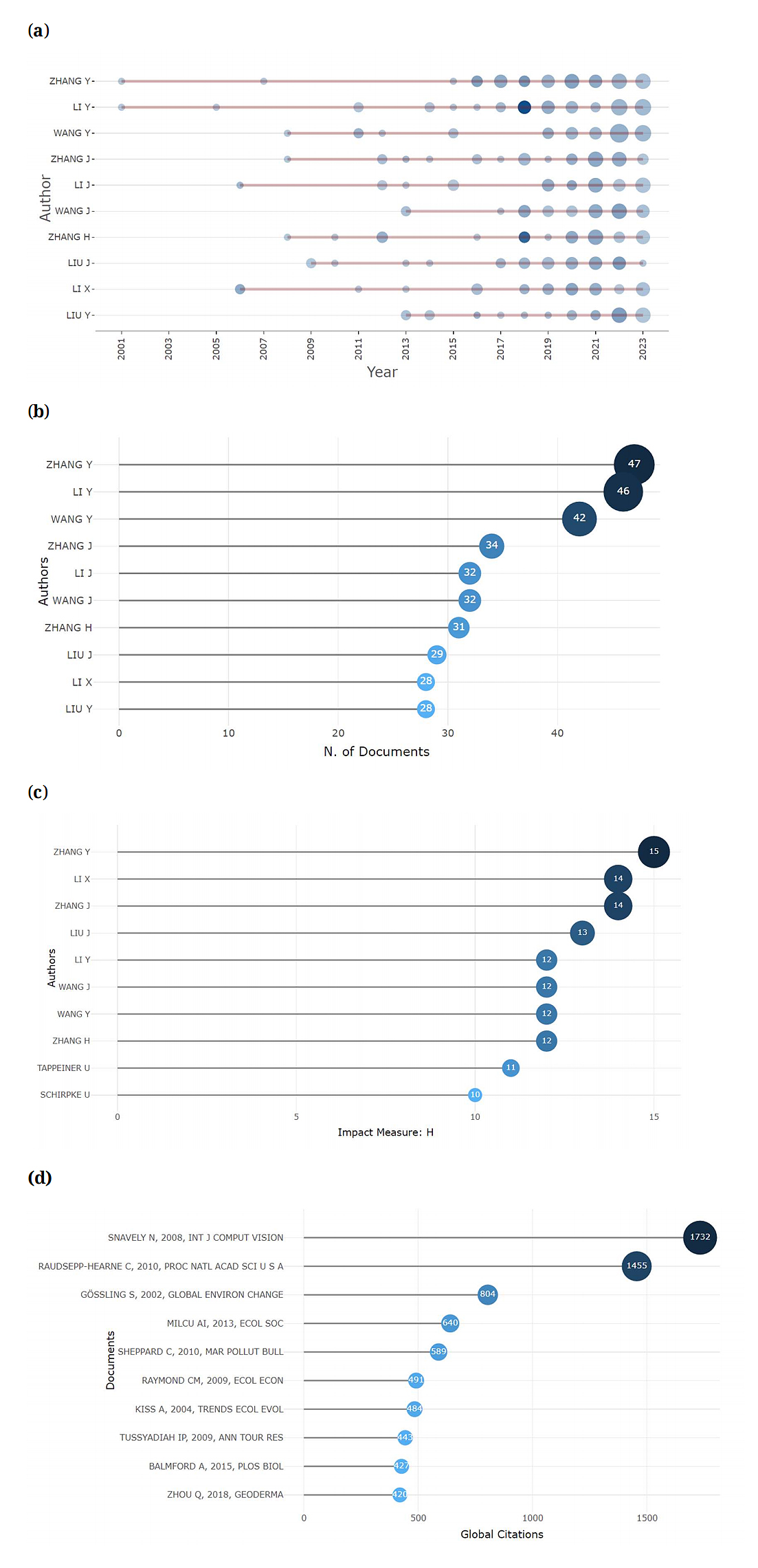 Author Production Yearly, Most Relevant Authors, Local Impact, Global Cited DocumentIn the spotlighted Figure 3a, which showcases the authors who have been actively engaged in the topic of wider landscapes toward tourismscape since the 2000s. Notably, Zhang Y has consistently shown high productivity throughout this period, maintaining their presence as prolific contributors until the end of 2023. Following them, Li Y emerged as a prominent author in the subsequent period, continuing the legacy of scholarly contributions, as well as the authors of Li J and Li X, the scholars who produced their scientific publications from 2006 until 2023.