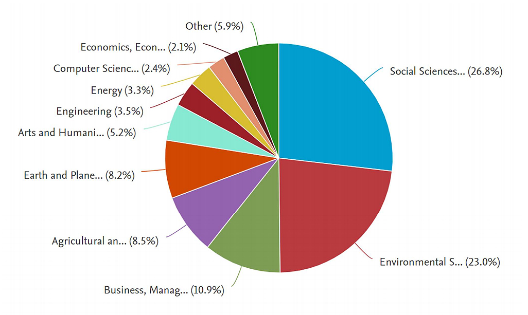 Distribution Topic by DisciplineThe study also revealed the distribution of topic proportions in various scientific fields in Figure 4. This analysis can be particularly valuable in understanding the dominant areas of research within the realms of wider landscape toward tourismscapes. Among the top five fields in terms of topic distribution, Social Science emerged as the leading field, surpassing others with a total of 4270 documents or 26.8%. Following closely behind was the Environmental Science field, which accounted for 3662 publications or 23.0%. Business, Management, and Accounting had 1742 or 10.9%, the field of Agricultural and Biological Sciences contributed 1360 documents, making up 8.5% of the distribution. Earth and Planetary Sciences had 1301 publications, accounting for 8.2%.