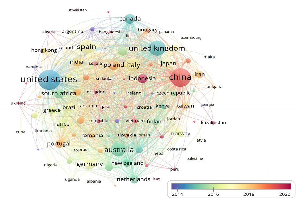 There is a high focus on affiliation and country in both data types. First, the Chinese Academy of Sciences, as the highest affiliate, produced the highest number of publications with 285 total publications, followed by the University of Chinese Academy of Sciences with 90 scientific publication, University of Johannesburg and Wageningen University & Research with a total of 61 article journal publications, in respectively. On the other hand, territory has also been shown, and the United States has the most publications, with 1146 publications. China is in second place with 983 total publications, and the United Kingdom has 658 publications. Table 2, also implies that the highest affiliations are produced by affiliates originating from China. China also ranks second for the territorial part, with the country producing the most publications about wider landscape toward tourismscapes. Furthermore, the analysis reveals that the United State, China, United Kingdom, Spain, and Australia are leading the way in terms of cross-counties collaboration publication, particularly in the fields of tourismscape.