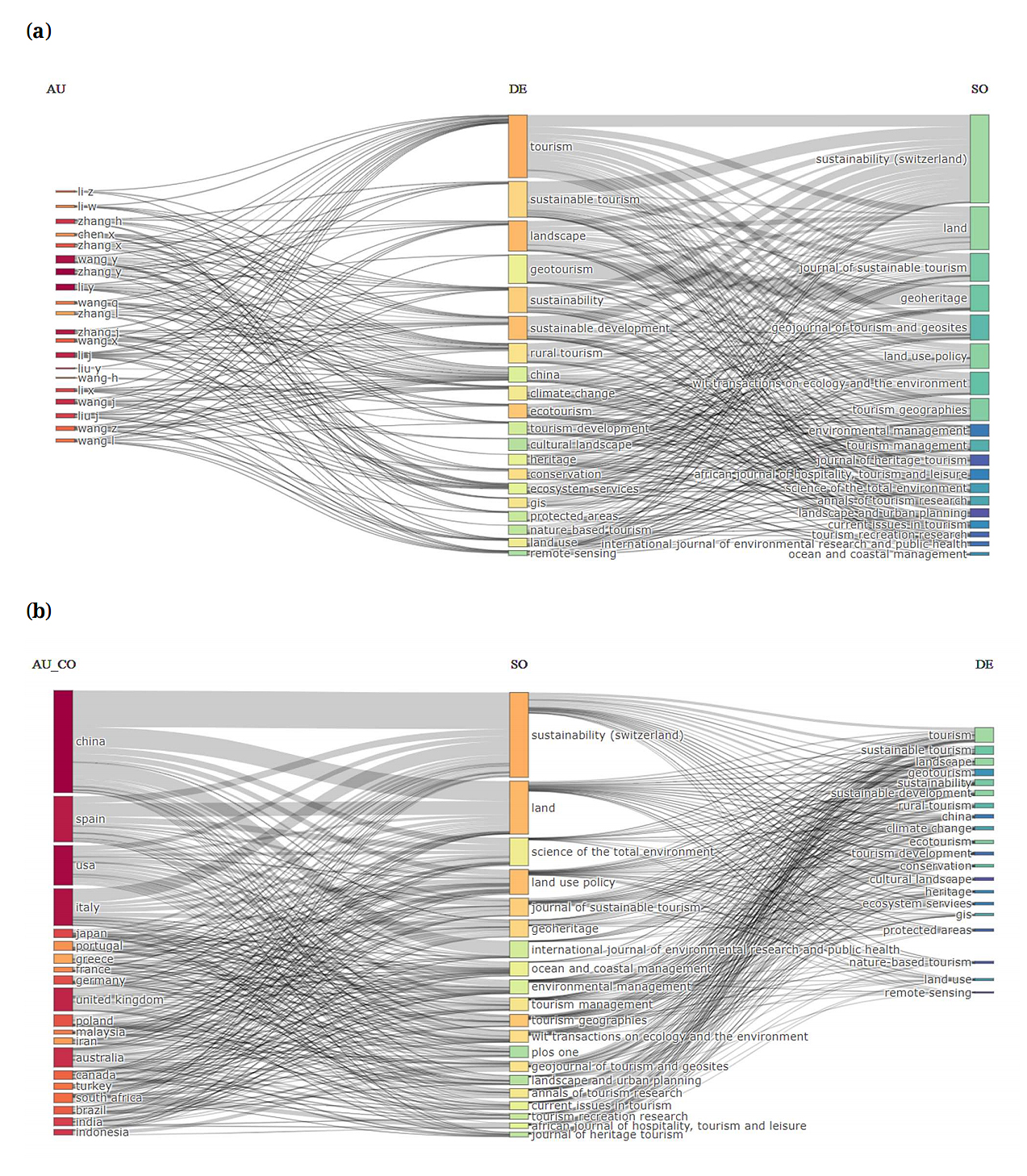 Three-field Plot AnalysisTo gain a deeper understanding of the dissemination of scientific publications, it is crucial to examine the specific plot that focuses on three-field plot aspects in the context of land and tourismscapes among author-keywords-publisher, and country-publisher-keywords. Within the realm of tourismscapes, there are fifteen distinct keywords by authors used that are widely explored (see Figure 6a), which is a notable concentration of publications being submitted to “Sustainability (Switzerland)”, “Land”, and “Journal of Sustainable Tourism” which are among the top ten publishers. Interestingly, China, Spain, USA, and Italy have published a significant number of their scientific works by territory distribution to “Sustainability (Switzerland)” and “Land” (see Figure 6b), both of which are affiliated with the MDPI publisher. Moreover, the prominence of the keyword “China” suggests that the territory plays a dominant in the field of tourismscapes.