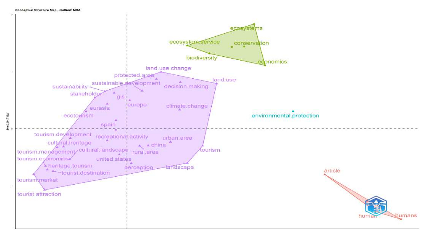 According to the factorial analysis in Figure 8, there are differences each cluster in the key terms. However, it is unclearly how the keywords distribution are related within a multiple cluster. There are, however, the conceptual structure map illustrates the interconnectedness of the terms within each cluster. The purple clusters exhibit a higher concentration of data dimensions and are interconnected, including categories such as “land use change”, “protected area”, “tourism attraction”, “landscape”, “tourism destination”, “tourism development”, and others. In contrast, the blue clusters consist of one term like “environmental protection”. Additionally, there are green clusters related to topics such as “ecosystem”, “conservation”, and “biodiversity”. Lastly, there is a red cluster focused on “human” directly connected to the well-being of “humans”.