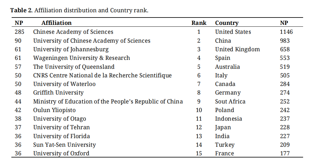 Author Affiliation and Country Rank AnalysisSeveral affiliates with a high level of interest have been responsible for promoting the transmission of scientific concepts dealing with landscapes toward tourism landscapes; this transmission represents a significant step forward in bringing attention to specific issues. One of the most significant advances that has been achieved is the dissemination of scientific articles that have been published in trusted journal sources. The number of included publications from affiliates (see Table 2) and territory where there is interest in land transformation studies from countries offering ideas published in scientific journals has been presented.