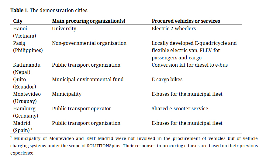 One of the enablers of sustainable transport solutions, and our main interest in the demonstrations, is the procurement of different public and commercial e-vehicles. Table 1 shows the seven city demonstrations we selected for our analysis. At each location, the implemented e-vehicle solutions were tailored to the specific requirements and goals of the city, while accounting for the contextual factors and constraints that affect the uptake of e-vehicles.