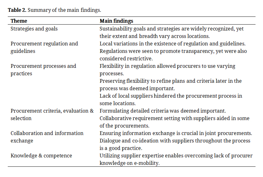 We conducted a qualitative study to examine sustainable mobility procurement practices globally, with a specific focus on e-vehicle procurements. To do so, we drew on interview and qualitative survey responses of procurers involved in a project aiming to promote urban electric mobility in Asia, Europe, and Latin America. By delving into the experiences of procurers from various geographical and cultural contexts, our study contributes to the existing body of research on e-vehicle procurement as well as sustainable procurement more broadly. Looking into procurements with similar characteristics carried out across different locations around the globe allowed us to explore the overarching similarities in procurement while uncovering some of the nuances that arise when implementing e-vehicle procurements in different parts of the world. Table 2 highlights some of the findings according to the six themes that were constructed based on the analysis.