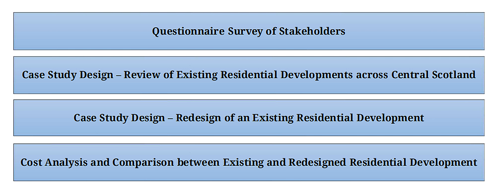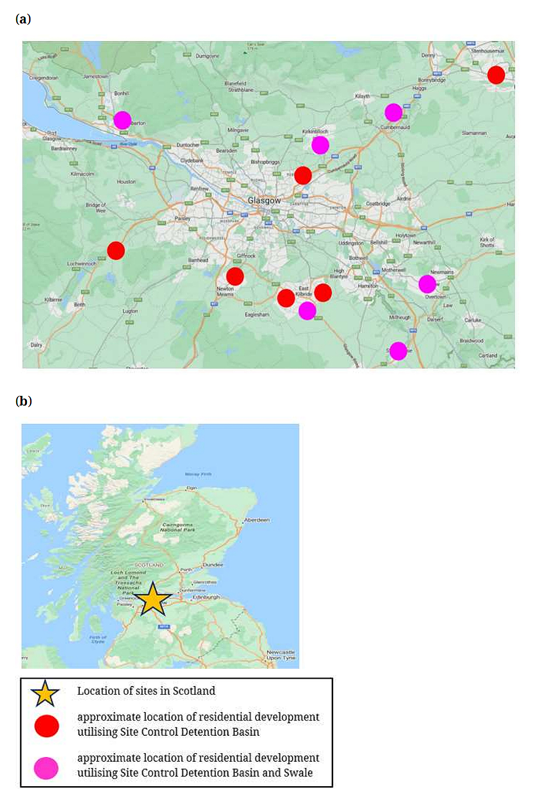 Case Study DesignTo determine the most common SUDS measure constructed in the residential property developments in Central Scotland, a review of existing residential sites was carried out. The review included sources such as the national ePlanning portal as well as company databases and personal communication with relevant industry professionals including Senior Engineers in a multi-disciplinary Consultancy, Senior Architects, Water Authority Engineers, and Local Authority Engineers.