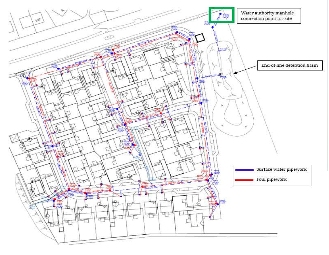 A residential site located in Falkirk, Scotland was selected as representative case study from the list of existing developments based on the designed features and the size of the development. The drainage for the existing 44-unit residential development has been constructed utilising a traditional gully and piped drainage system that drains to an end-of-line detention basin to treat and store the surface water run-off prior to discharge into the existing drainage network owned by the water authority located in the North-East corner the site (Figure 3).