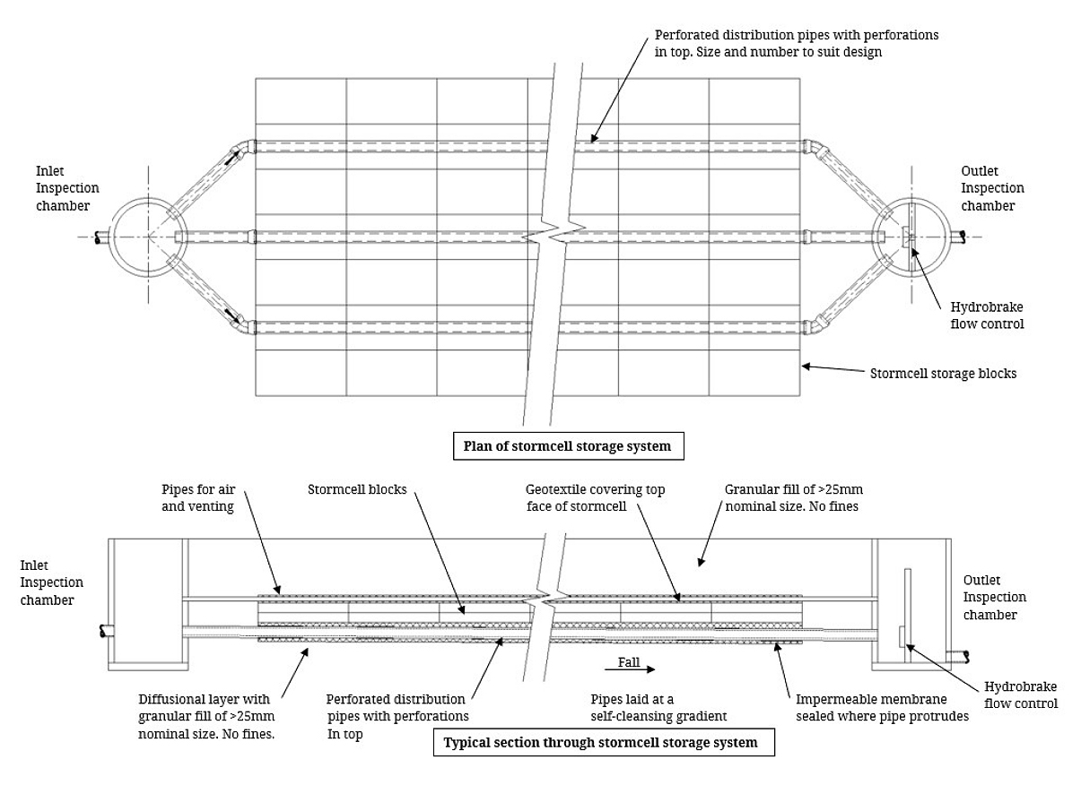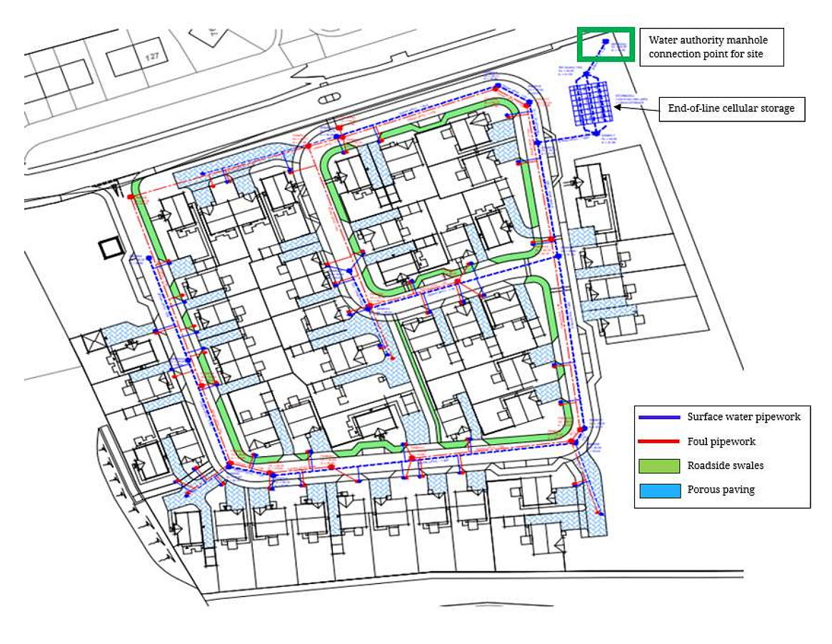 The re-design drainage network has been modelled utilising commercially available software [39] which has highlighted that a minimum of 170 m3 storage capacity must be provided within the drainage network system to ensure no flooding occurs. This has been modelled by incorporating porous paving and swales at source, which limits the concentration of flows entering the end of line storage. To minimise the risk of flooding down-stream, an end-of-line cellular storage tank (Figure 8) has been designed. By implementing different SUDS features in sequence, this has reduced the requirement of the end-of-line storage capacity from 410 m³ to 170 m³ resulting in a net reduction of 58% as the flows are being temporarily stored and restricted at the point of impact.