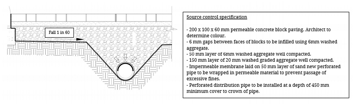 The surface water that passes through the porous paving (Figure 5) will be treated and attenuated within the gravel sub-base layer below and act as a temporary storage layer to reduce the effects on the downstream network. Below the gravel layer, a permeable membrane will be installed to allow partial infiltration into the ground if the existing sub-soils permit and prevent the sub-soil blocking the clean gravel drainage layer. The run-off will gradually flow through the voids in the gravel sub-base layer, partially infiltrating into the ground below, and flowing to the lowest point of each driveway as a treated runoff. At the lowest point of the driveway, a perforated piped outfall will be placed to allow the treated run-off to connect into the main piped drainage network and flow into an existing outlet point owned by the water authority.
