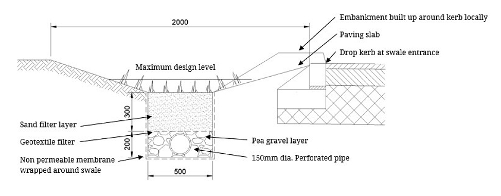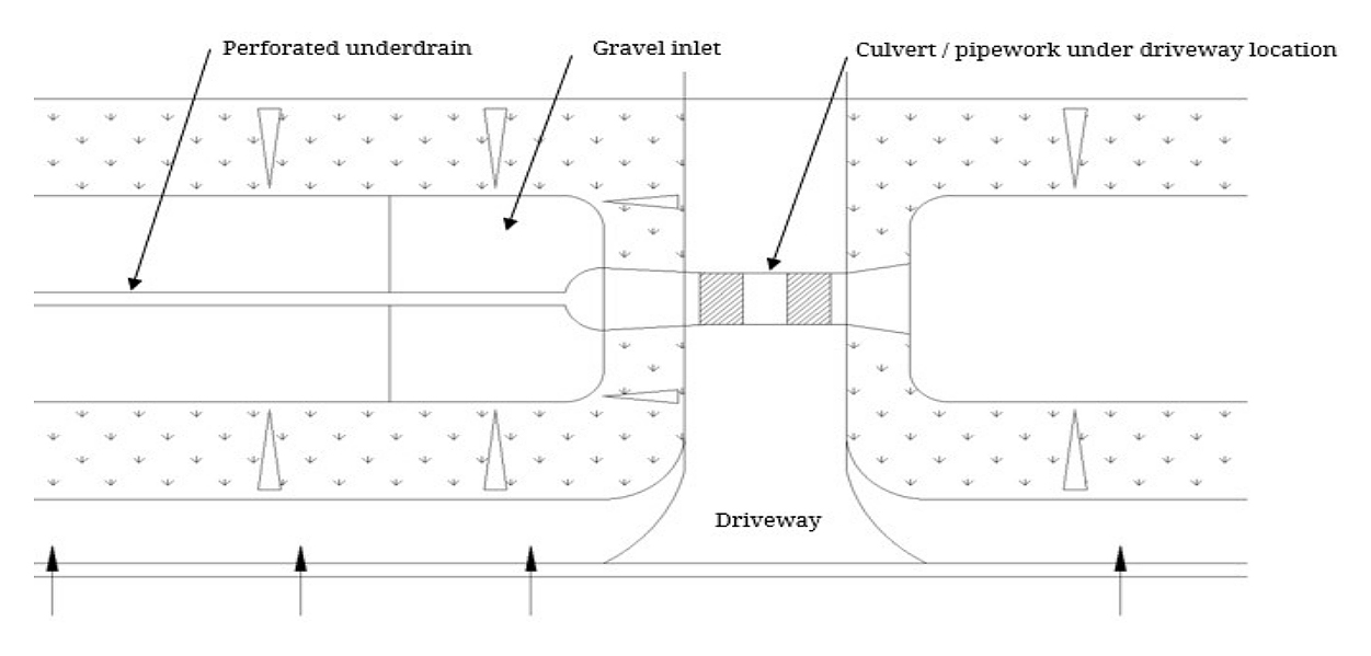 The run-off from the road network which will be adopted by the local authority is envisaged to be treated and attenuated using roadside swales (Figure 6). The roads are designed with a cross-fall to one side were dropped kerbs will be installed to allow the run-off to pass into the swale system. The surface water is designed to be pre-treated as it passes through the sloped sides of the swale and will be further treated as it infiltrates through the sand filter layer. The run-off from the roads will gradually pass through the sand filter layer and into the perforated pipe below to allow the flows to be conveyed to the existing outlet owned by the water authority. At each driveway crossing location a pipe will be connected below (Figure 7) to allow continuity of the flows passing under any such location.